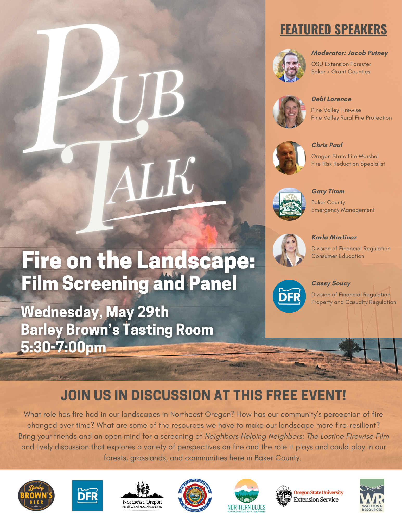 Flyer for the Baker Pub Talk featuring a screening of the short film Neighbors Helping Neighbors: A Lostine Firewise Film