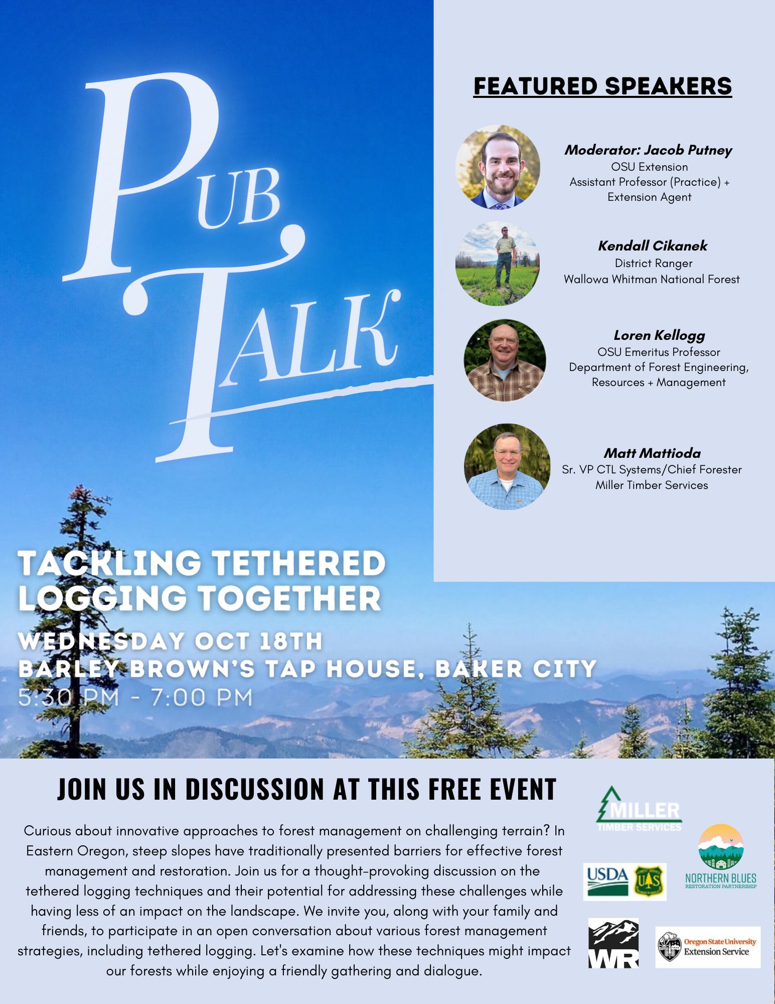 Flyer for Pub Talk in Baker City discussing Teathered Logging and it's use in Eastern Oregon